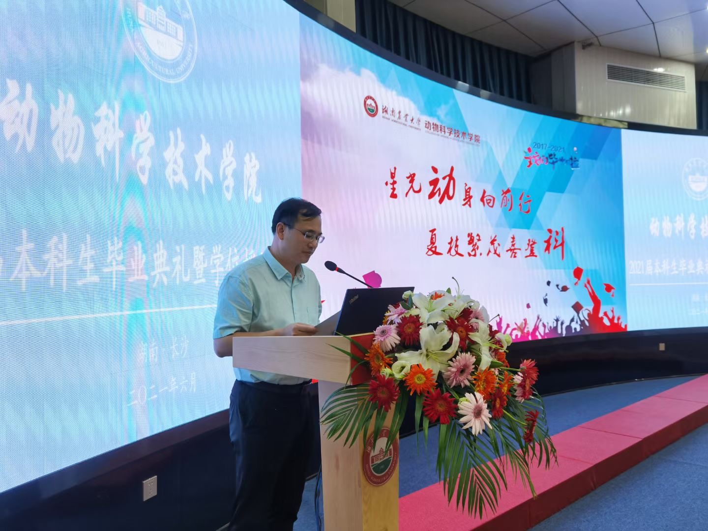 6月10日上午,永利yl23411官网2021届毕业生典礼暨学位授予仪式于生命科学楼国际会议厅隆重举行。校党委书记陈弘教授、校党委委员副校长吴波教授出席,佳和农牧股份有限公司企业代表、学院领导班子、学术委员会成员、毕业班班主任等及2021届全体毕业生参加,仪式由学院党委副书记肖露主持。