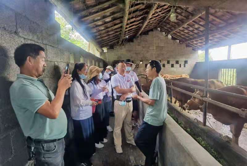 据云鹤村驻村书记廖明权介绍,云鹤村现有牧草种植面积 120 多亩,种牛200多头,年产值达300多万元。在云鹤村村民通过肉牛生态养殖实现脱贫以后,先富带动后富,带动了毗邻的茅坡村部分村民一同开始肉牛养殖,以期实现共同富裕。在养殖大户马长明家的养殖场里,同学们切身实地看到了健硕的西门塔尔牛与湘西黄牛杂交后的子代品种。据马长明介绍,这种杂交子代肉质肥美,肉产量高,且生长速度快,是一种非常优质的肉牛品种,通过两年的培育,就可以卖到每头牛两万多元。值得一提的是,马长明家里的两头黄牛患有结节病,病怏怏地被隔离在单独的牛棚里。博士团专家的到来,为他解决了燃眉之急,方热军教授和田科雄教授,知无不言,主动联系了湖南省动物疫病专家探讨相关的防疫问题。随后,博士团又马不停蹄地走访了几个养殖大户的养殖场,针对不同的生产问题,专家们都给出了专业的对策和意见。