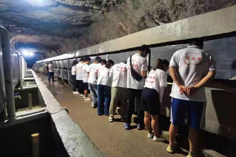 下午,在桑植县畜牧水产局陈国平主任的陪同下,博士团赶赴张家界大鲵养殖产业基地进行考察调研。在一座镂空的山体内部,博士团的成员走过冗长的五百米甬道。水汽弥漫里,温度逐渐下降到 20℃。由于大鲵生长繁殖不喜光,整个养殖的洞穴里,光线昏暗,悄寂无声。